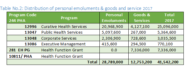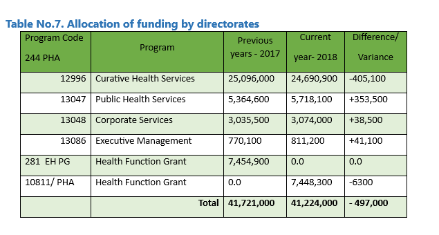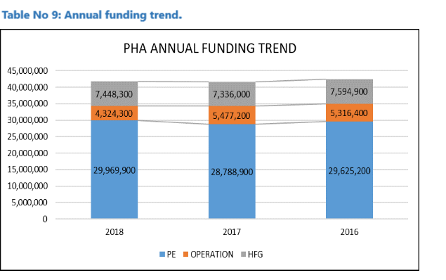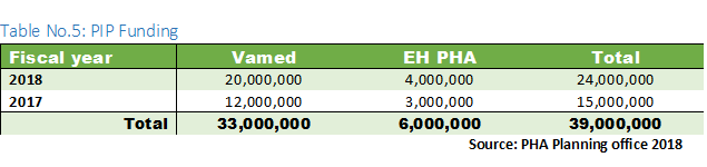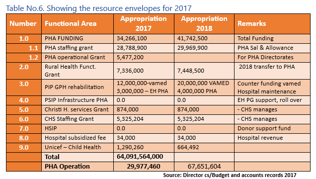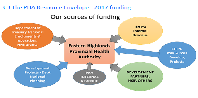 In 2017 EH PHA received from, Department of Treasury funding for personal emoluments and Goods and services for recurrent expenditures. Health Function Grant funding continued to come from the EH Provincial Government Budget. Department of National Planning and monitoring for funding of the Public Investment Project (PIP). PSIP Development Project from the Provincial Government.