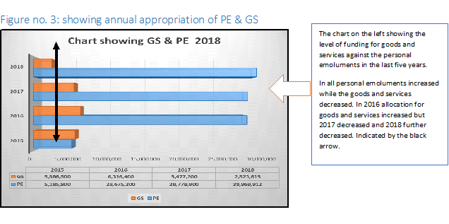 The above funding are specifically for two major cost centres to support for the government health care services delivery. The level of funding annually to the EH Provincial Health Authority on goods and services at 30% while personal emoluments takes the biggest share and is funded at 70% of the total budget allocation in any given year. In comparison on an annual bases there is less funding for goods and services to pay for the organizations operations. Refer to figure 3.