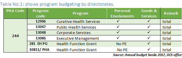 In 2015 Eastern Highlands PHA was introduced to IFMS and through the Integrated Financial Management System(IFMS) Budgeting module proposed for the program budgeting in line with the PHA arrangements by directorates and this is being implemented up to now. All PHA Provinces are in these budgeting mode. To go into program budgeting Treasury Department has allocated a numbering codes to identify each program for budgeting. Refer to table.1.