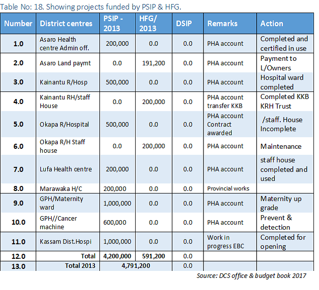 The Public Investment Project for the Eastern Highlands Provincial Health Authority is submitted through the budget and direct to the office of the National Planning for funding. In 2017 the Government increased our funding to include the 15% counter fund funding for the Vamed in construction of the Goroka Diagnostic and Surgical Centre. ( See table for 2017 & 2018 PIP).