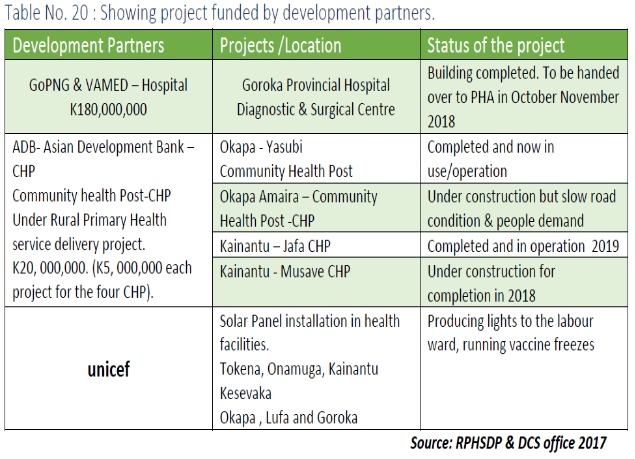 The table below shows the development partners and GoPNG support for the development of health facilities for improved health services delivery.